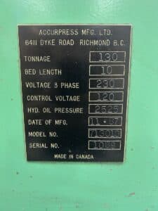 Accurpress 713010 130 Ton x 10′ Press Brake