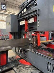 Drilling Unit: 3 ADM Drilling Units w/ 3 Automatic Tool Changer, Part Marking, Bandsaw Integration, Feeding Arm, Material Clamping, Automatic Tool and Material Measurement, 4th Side Layout Marking, Chip Conveyor, High Speed (20,000 RPM) Scribing Tools, Lantek Flex 3D Steel Work SD Plus Software, 60′ Infeed with Transfers, 60′ Outfeed with Transfers Miter Bandsaw Unit: Automatic Blade Tensioning System, Chip Brush for Blade, Integrated Chip Conveyor, Clamping Vice, Magnetic Material Discharge System, Feeding Arm with 60′ Infeed with Transfers, 60′ Outfeed with Transfers, AKYAPAK AST Controller Software