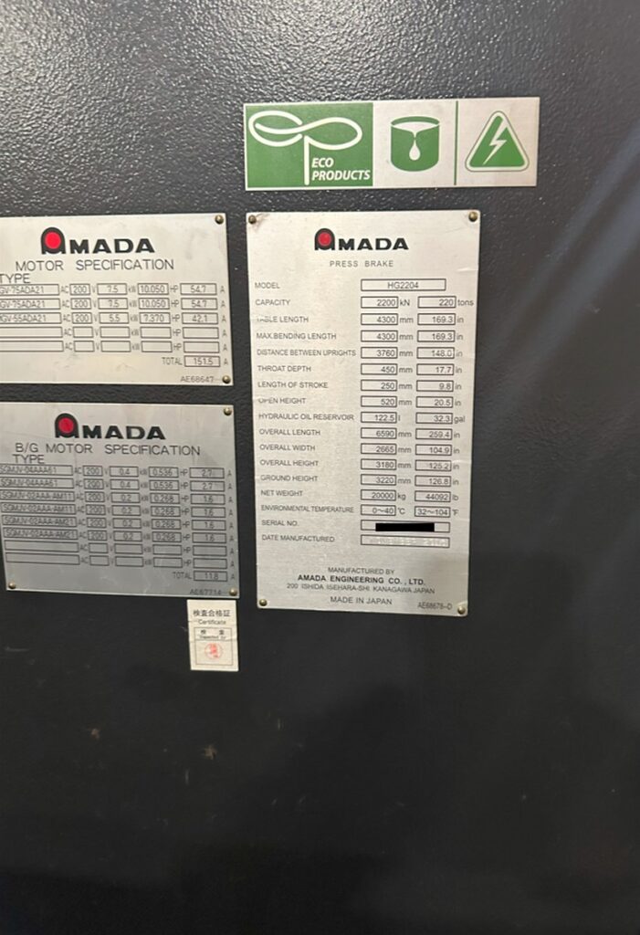 Amada HG-2204 242 Ton x 14′ Hydraulic Press Brake