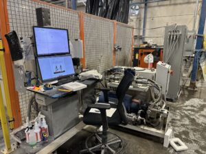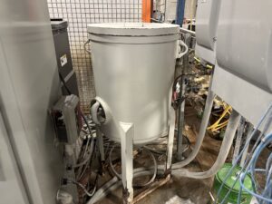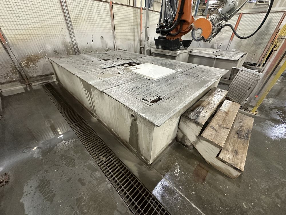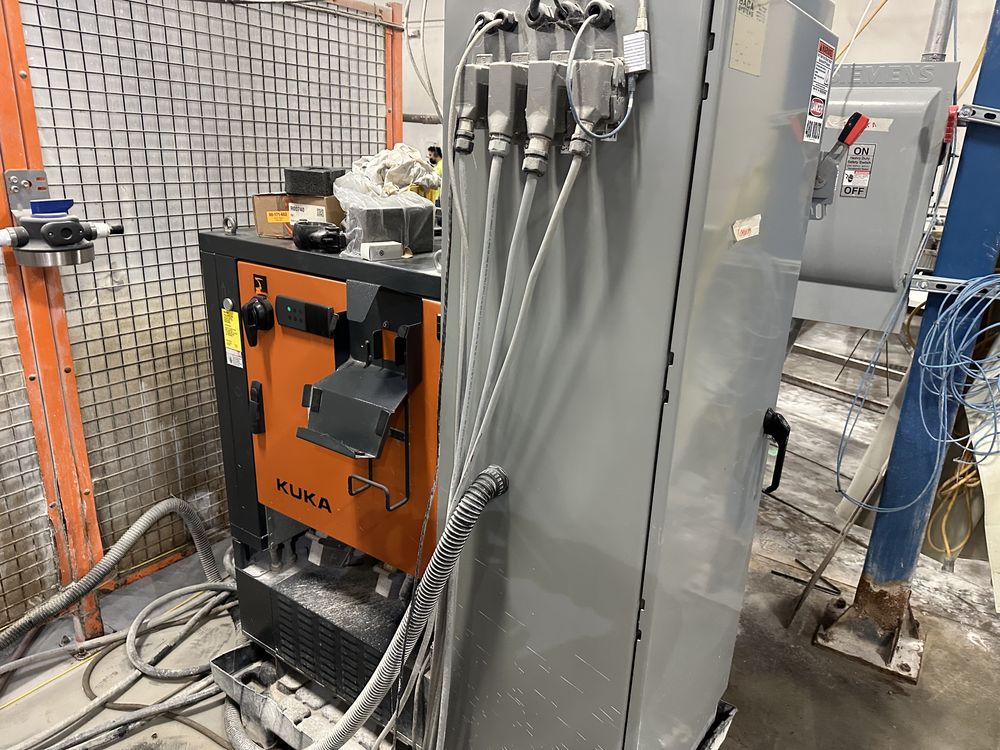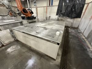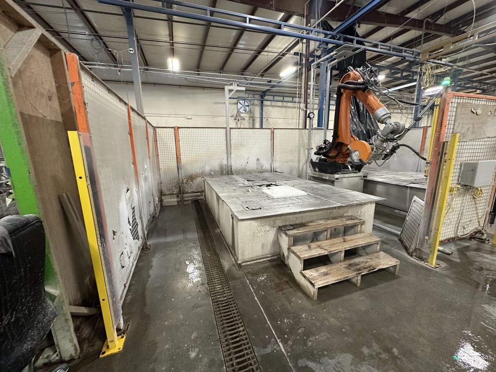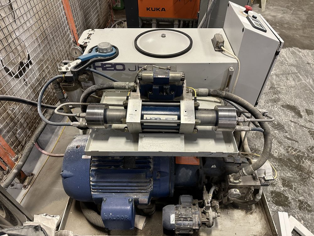 Kuka KR 210 Robot, H2O Jet Pump, Dual Cutting Tables, Controls, Safety Encloser, Hopper