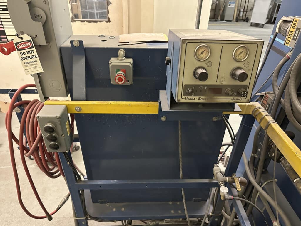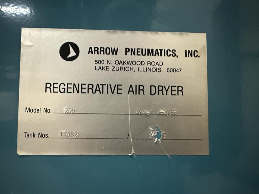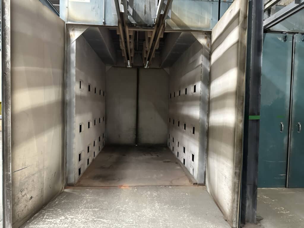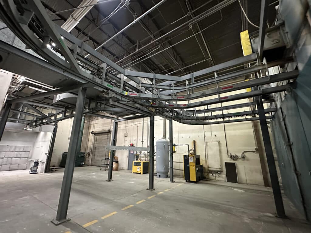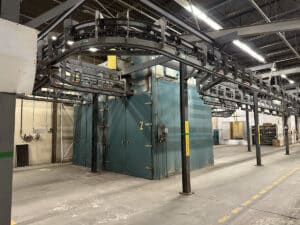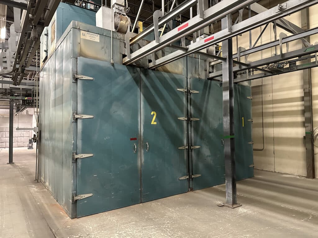 NORDSON 524 Reclaim Powder Booth System, 5′ x 6′ Opening, 16′ x 7′ x 8′ Chamber: (2) Versa-Spray Paint Units and Spray Guns, (2) Nordson Fire Sensors, Nordson Rotary Sieve Unit, (4) Nordson 100 Plus Powder Transfer Pumps, (4) Color Module Fluidize Hoppers, Bulit In Air Filtration, Exhaust, Fan / Blower System, (2) Steel Stair Platforms, Approx. 100 ft Water Hose, Interior Chamber LED Work Lights (2) Thermal Engineering 13’6″ L x 8′ W x 10′ H Walk-In Powder Coating Bake Ovens Jervis Webb Overhead Powder Coating Conveyor Line w/ Mighty Lube 7065B Automatic Lubrication System: Approximately: 400 ft of conveyor line, (1) Mighty Lube 7065B Automatic Lubrication System, (2) Mighty Lube 5054 Rail Lubricators, Approx. (10) Vickers 250 psi Hydraulic Cylinders, (4) Control Box / Switches, (4) Ross Pneumatic Regulators, Pressure Gauge and Filtration Systems. Arrow Pneumatics Model 209 Twin Towers Regenerative Air Dryer: (2) Steel Fab Air Receiver Tanks MAWP 200 PSI at 500°F.