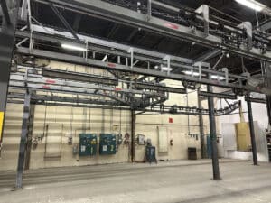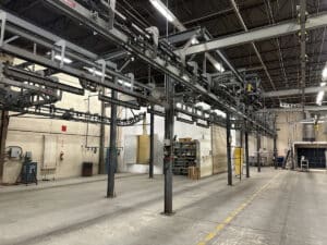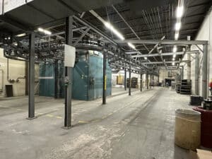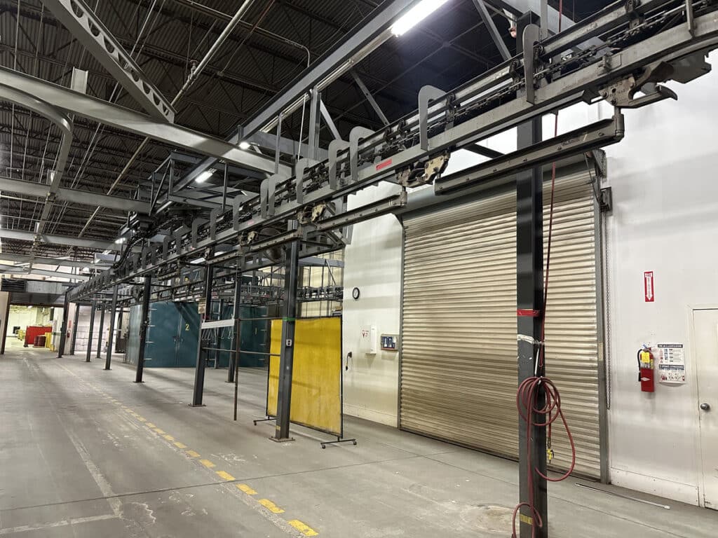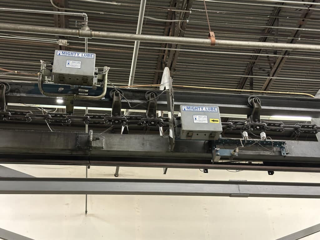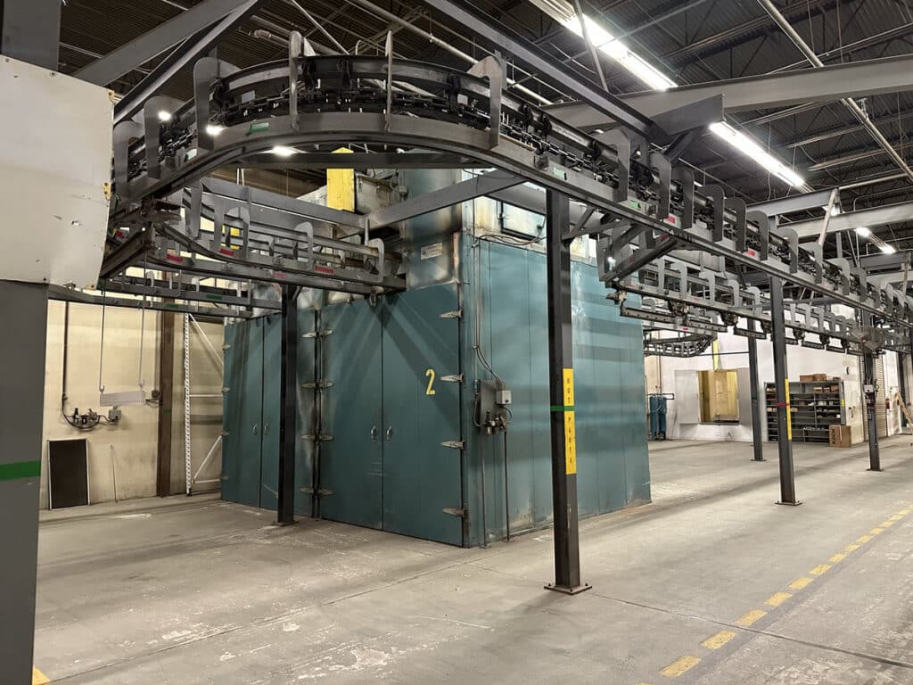 Complete Powder Coating Line: (1) Nordson Powder Coating Booth, (2) TEC Bake Ovens, Jervis Webb Conveyor Line w/ Mighty Lube Automatic Lubrication System