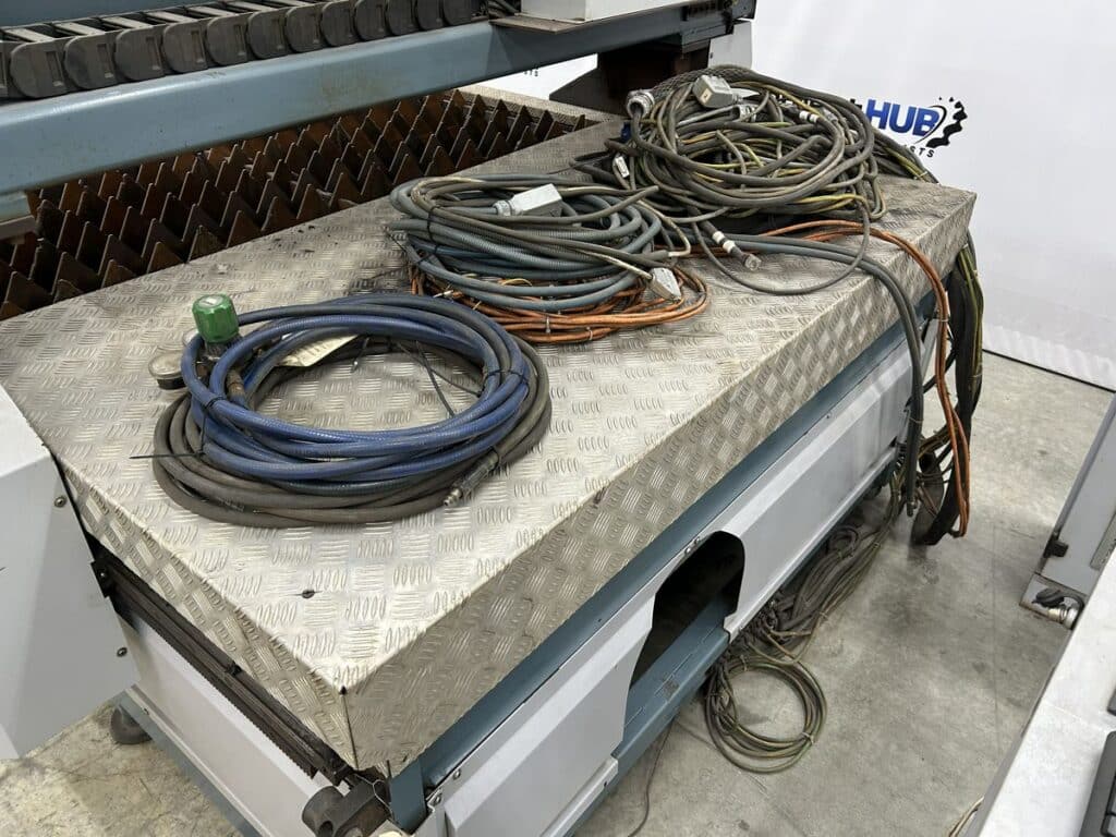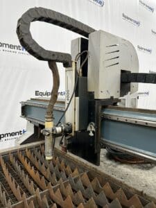 Siemens Sinumerik CNC Control with Full Keyboard & Color Monitor, Sinamics Servo Drive System, Hypertherm M4000 Plasma Cutting Head with Torch Height Control (THC), Breakaway Torch Collision Protection System, Double-Sided Synchronized Planetary Gear Drive (Y1/Y2 Axes), Precision Rack & Pinion Drive System, Segmented Slat Cutting Table with Water Trough, Ethernet Connectivity Port, Electrical Cabinet with Main Disconnect Switch, Assorted Cables and Hoses Included