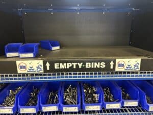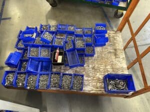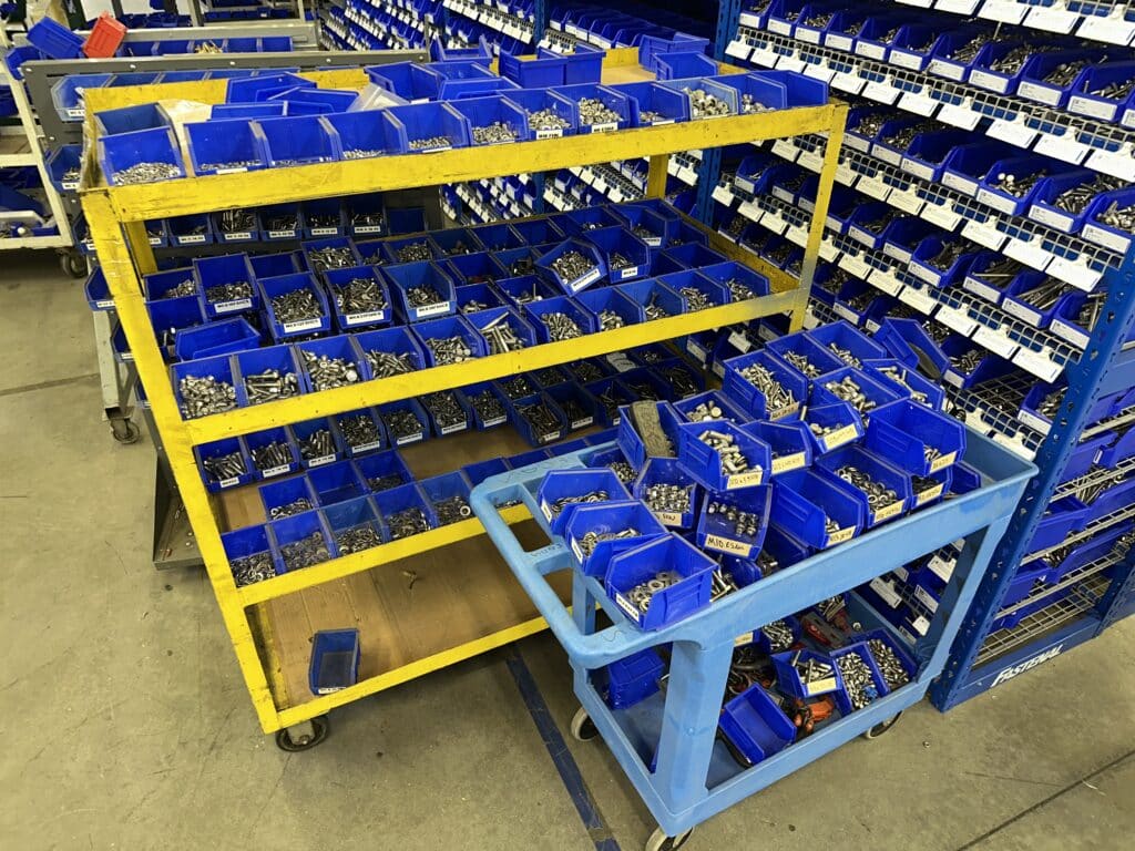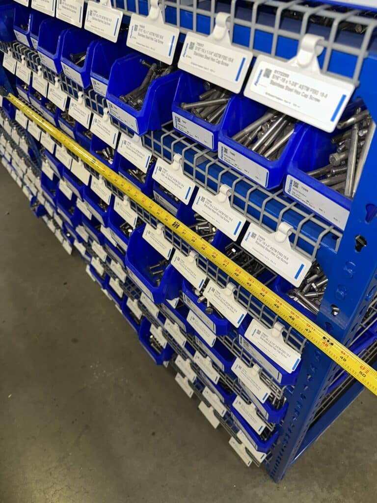 (10) Fastenal Shelving Units with Labels on both racks and Bins, Each Rack Approx Dims: 48″ L x 24″ W x 80″ H, Plus Additional (12) Various Carts w/ Bins of Misc. Hardware. 1000+ Labeled Plastic Organizing Bins of Hardware.