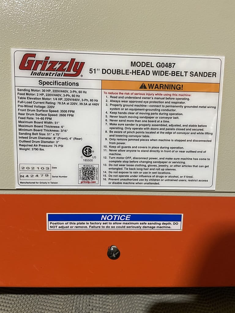 Grizzly G0487 51″ , 30 HP Double Head Wide-Belt Sander