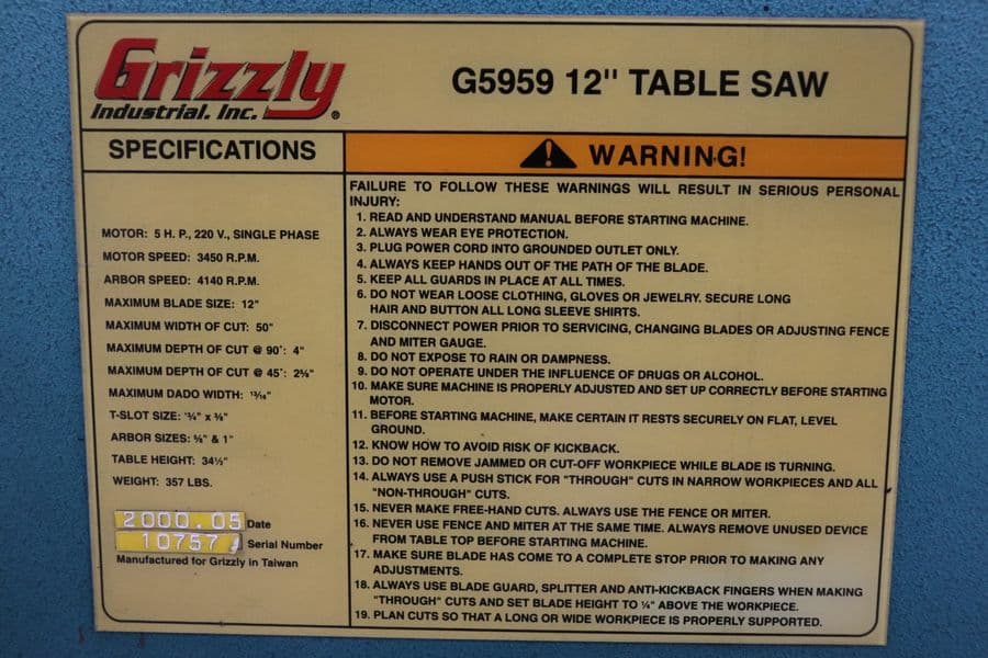 Grizzly G5959 12″ Sliding Table Saw