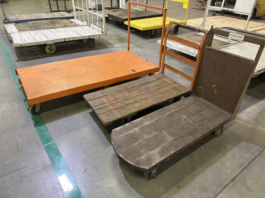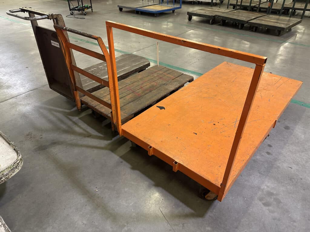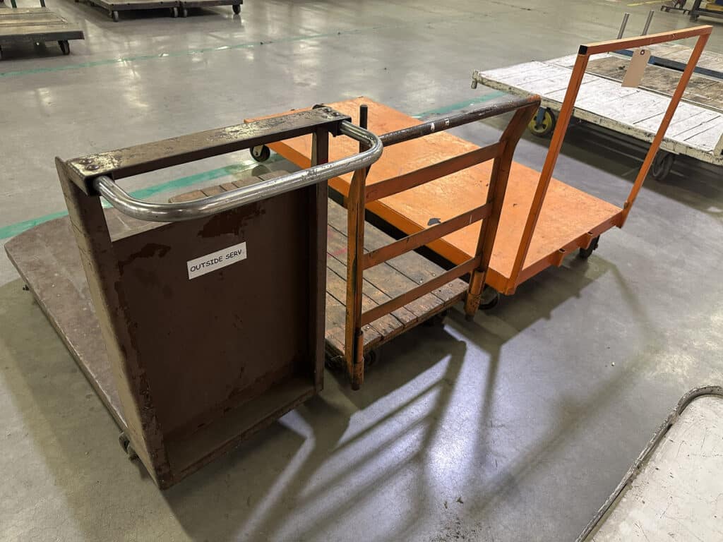 (1) 72″ L x 36″ W x 41″ H Orange Metal Cart, (1) 4′ L x 2′ W x 3′ H Orange Steel Frame, Wood Deck, (1) 48″ L x 20″ W x 38″ H Brown Metal Cart. This listing will be priced and sold as a group of (3) Carts. Dimensions, Color and Condition vary. As Pictured