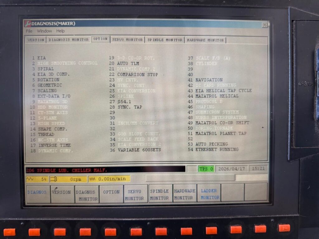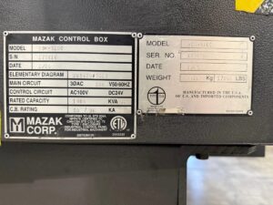 Synchronized Tapping, EIA, SPIRAL, EIA 3D Comp, Rotation, Geometric, Scaling, EXT-Data I/O, Shape Comp, Thread, Inverse Time, Auto TLM, Comparison Stop, G54.1, SYNC. TAP, Variable 600 Sets, Navigation, EIA Helical Tap Cycle, Mazatrol Helical, Mazatrol CO-OR Shift, Mazatrol Planet Tap, Auto Pecking, Ethernet Running, 10 in Rotary Table, RENISHAW Probing & Probe, MPG Manual Pulse Generator, Work Light, High Pressure Thru Spindle Coolant Option, Belt Type Chip Conveyor, Coolant Tank, Leveling Pads, Machine Manuals & Schematics