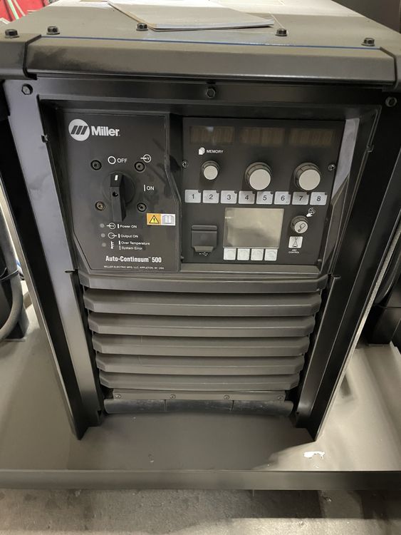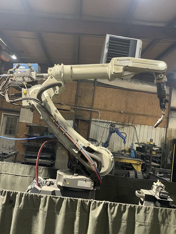 Miller Auto-Continuum 500 Welder, Panasonic TM-2000G III Robot, Teach Pendant Control, Servo positioners at each station for part rotation, robot controlled three piece base for easy relocation, Harmony Software, Touch sensing Software, Through Arc sensing