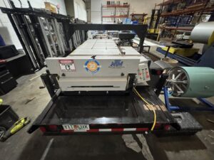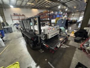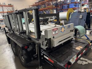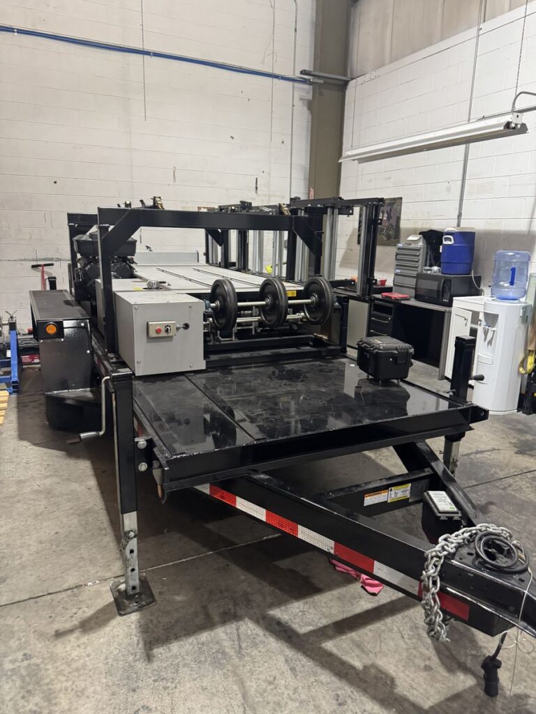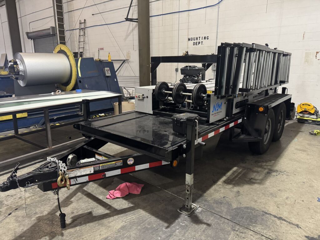 5V Crimp Panel Machine, 5VC Striation Assembly w/ Frame, 12,000 lb Tandem Axle Trailer, Dual Overhead Bolt-on Reel Stand, Expandable Arbor 16″ & 20″ ID, Run Out Stands (4), New Tech Controller Programmable Logic Controller