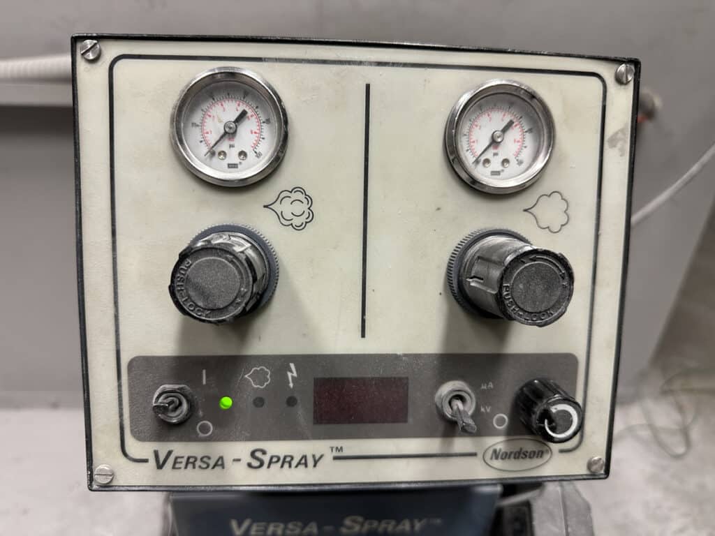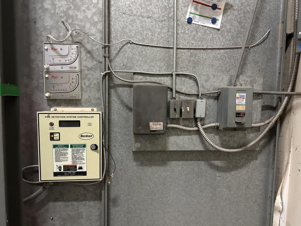 Booth: Nordson Fire Detection System and Controller, (2) Dwyer Mark II Model 25 Manometers, Interior LED Work Lights, Built In Filter, Exhaust and Fan/Blower System Versay-Spray System: Versa-Spray Controller, Versa-Spray Wand, Powder Hopper, Exhaust Tube, Cart