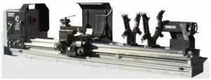 One piece (monolithic) bed, floor type casting, Three way design, 2 “Vee” ways on top plus 1 extra front lateral way for more apron-carriage support, All three ways are hardened and ground, Forged steel spindle with opposed taper roller bearings, Dual chucks are optionally available, Hardened and ground gears and shafts throughout, Hardened and ground cross slide ways and screws, Electromagnetic spindle brake, Universal inch / metric gear box, totally enclosed, Automatic four speed electronic variable speed, Spindle Bore standard 9” spindle nose A2-15. Bores from 10” up to 32” are optionally available, Six way rapid traverse and power feed to top slide, Thread chasing dial, Overload safety device on apron, Dual voltage motor and controls, standard 50 HP, optional 75 HP, Retractable leadscrew / feed rod support on models over 120″ cc, One piece stainless steel lead screw protection cover, Rear chip conveyor and full length rear splash guard is optionally available, Safety chuck guard with micro switch and jog button is standard