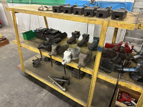 Large Revolving Inventory of Vises and Mill Workholding Accessories – Bench Vises, Toe Clamps, Rotary Tables, Collet Indexers, Etc.
