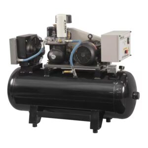 Standard Accessories: Compact open cabinet design, 100% continuous duty cycle, Rotary screw air end, Oil-injected belt-driven pump, 7.5 HP TEFC IP55 electric motor, Automatic starters with phase and sequence failure detection, 24V microprocessor controller, ASME certified horizontal air receiver, Oil sight glass, Air filter, Belt guard, Pressure gauge, Manual condensate drain
