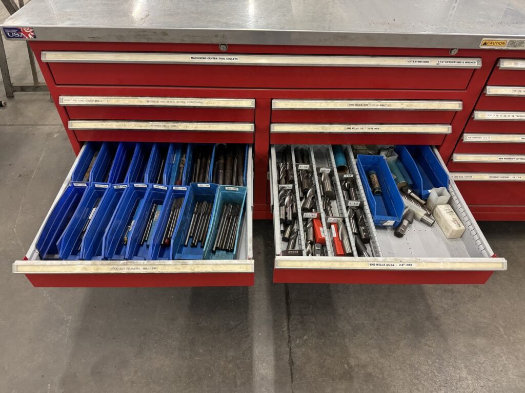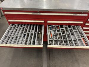 An assortment of tool collets, countersinks, HSS end mills, reamers, woodruff cutters, ball end mills, dovetail cutters, metric taps, corner rounding end mills, helicoil taps, insert cutters, and circular cutters