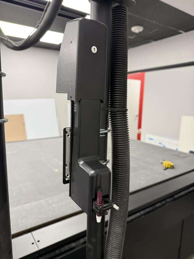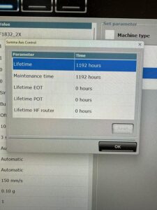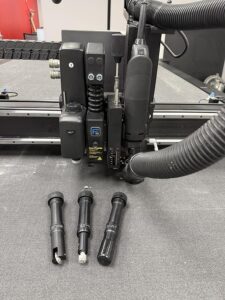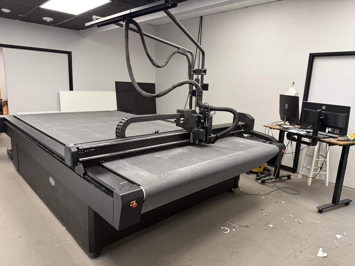This Summa F1832-2 flatbed cutter with conveyor and roll-off is available now. Tools include router, HD cutout knife, double edge cutout knife, kiss cutting knife, creasing tool 2, and pen module.