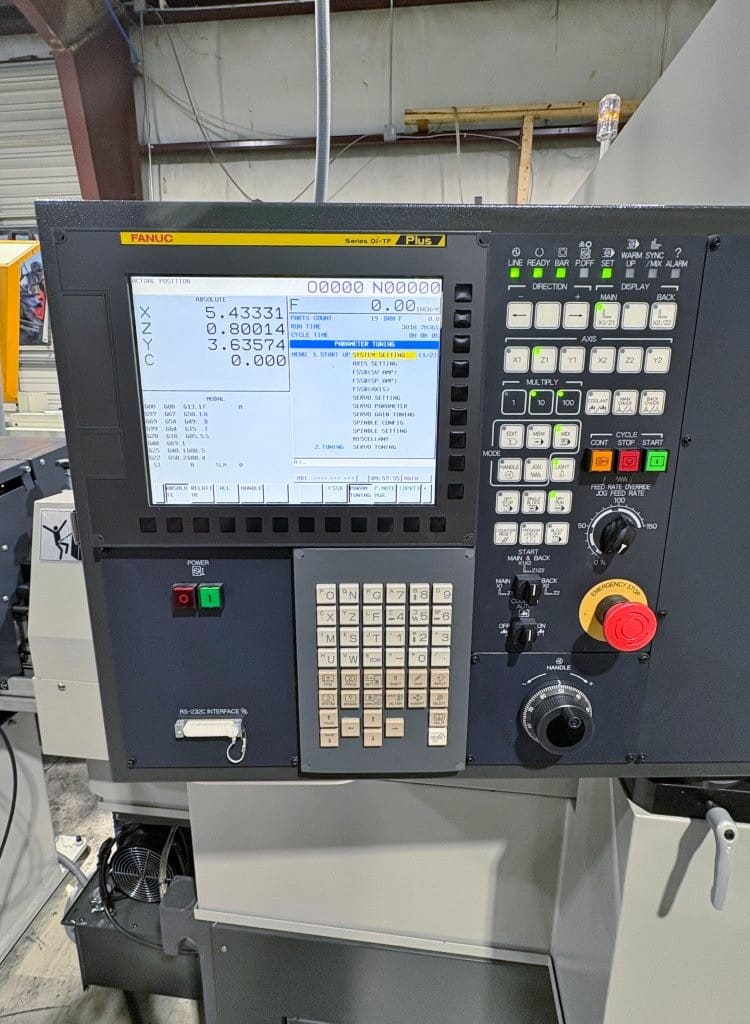 32mm Bar Capacity, 5 Controlled Axes, Fanuc 0i-TF Plus Control, FMB Turbo 3-38 Magazine Bar Feeder (12′), LNS Chip Conveyor, Full C-Axis Main & Sub, Mist Collector, 118 Cutting Hours