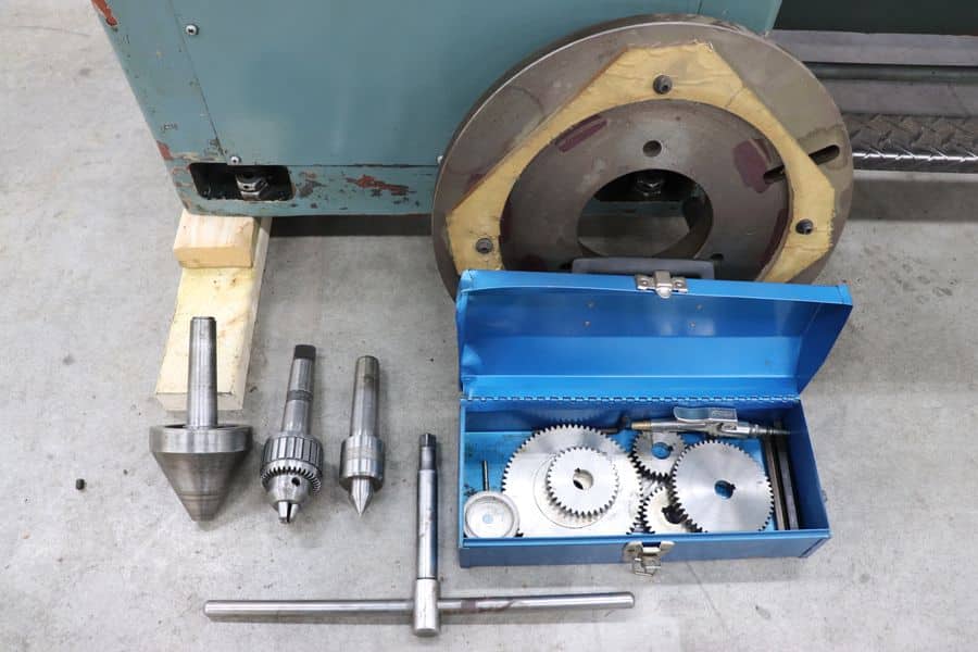 4 Jaw Scroll Chuck, 15-3/4″ Faceplate, Aloris Model CA Tool Post, Chuck Key, 1/2″ Jacobs Chuck MT. 4, Trademark Small Live Center, Unbranded 4″ Live Center, Change Gears, Taper Attachment
